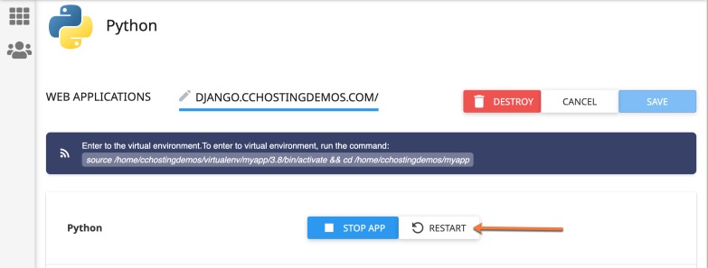 cPanel creates the application and sets up the Python environment in the top right corner of the page. - At the top of the page, next to Enter to the virtual environment. To enter the virtual environment, run the command and copy the command. You will need this information in the following procedure.